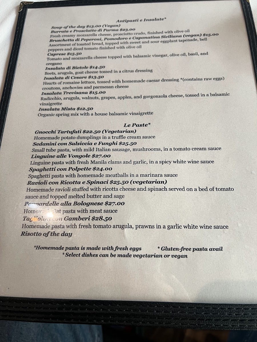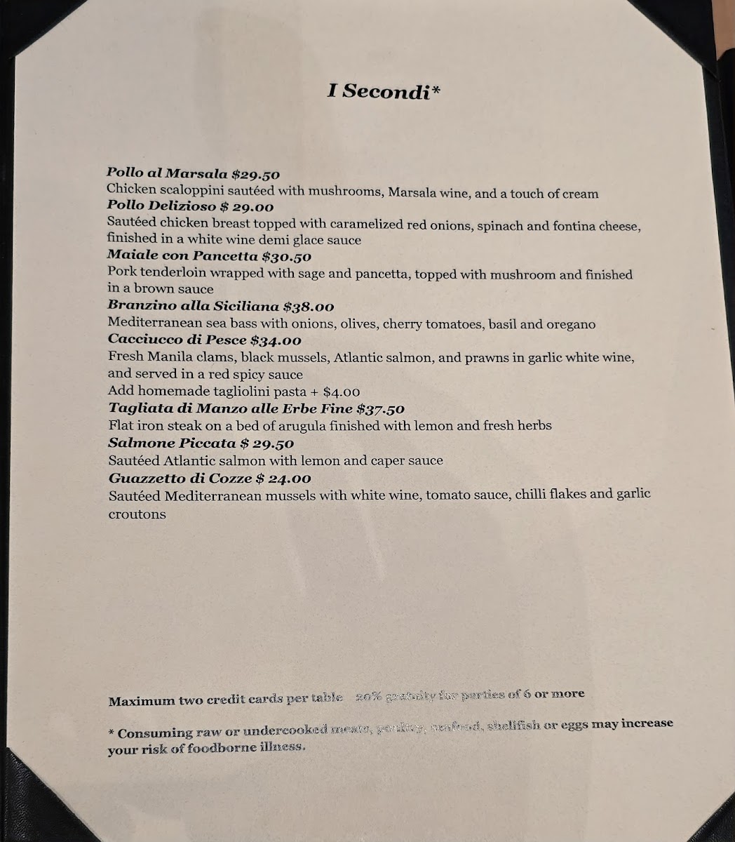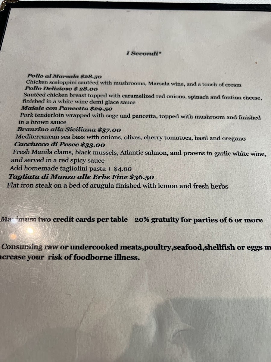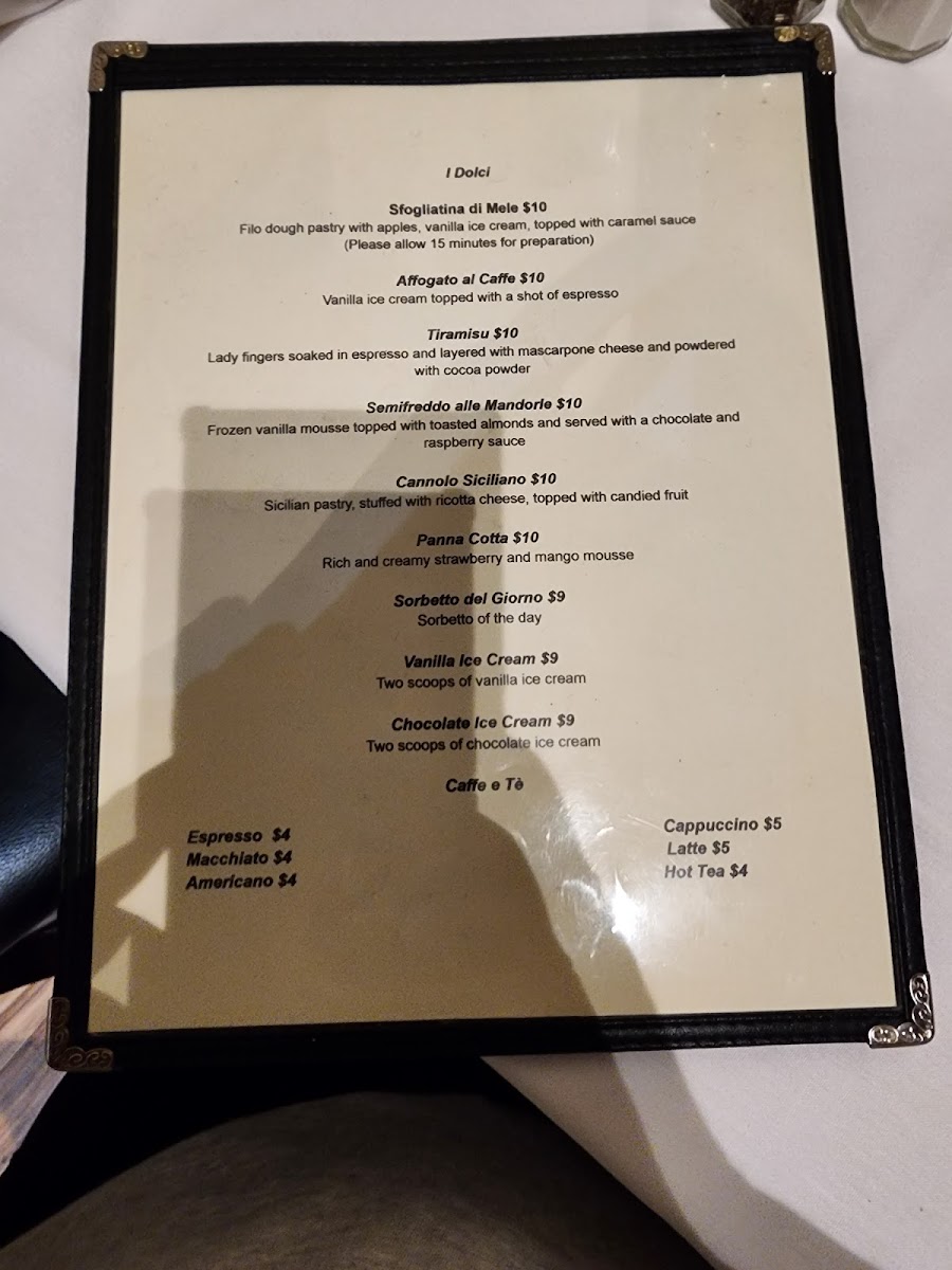 As you savor your meal, don’t forget to browse the dessert selections. The Tiramisu, a traditional delight, is an exquisite finale—layered lady fingers soaked in espresso and mascarpone, dusted with cocoa powder, all for $11. Or perhaps, indulge in the delightful Sfogliatina di Mele, where filo dough embraces warm apples and vanilla gelato, creating a heavenly experience that requires patience, as it’s made fresh to order.